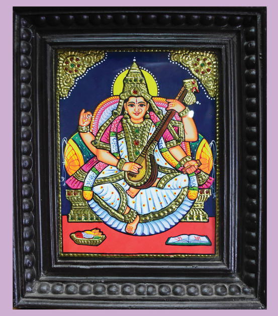 Tanjore painting of Goddess Saraswati, embodying calm and concentration, showcases ...