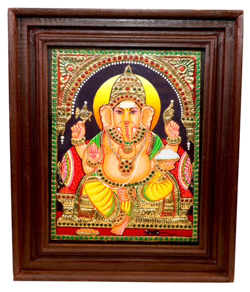 Tanjore painting of Lord Ganesha seated in a yellow dhoti ...