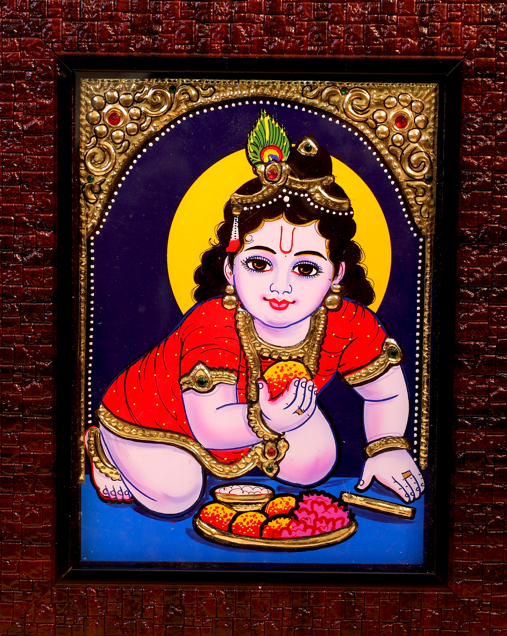 This Tanjore painting depicts a charming Krishna enjoying fruits, showcasing his playful spirit and divine presence.
