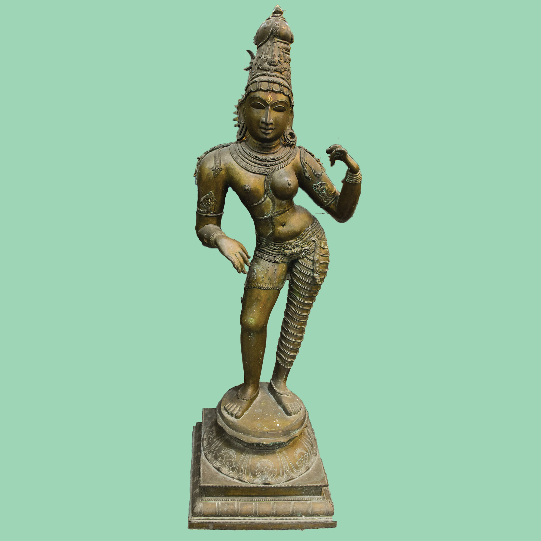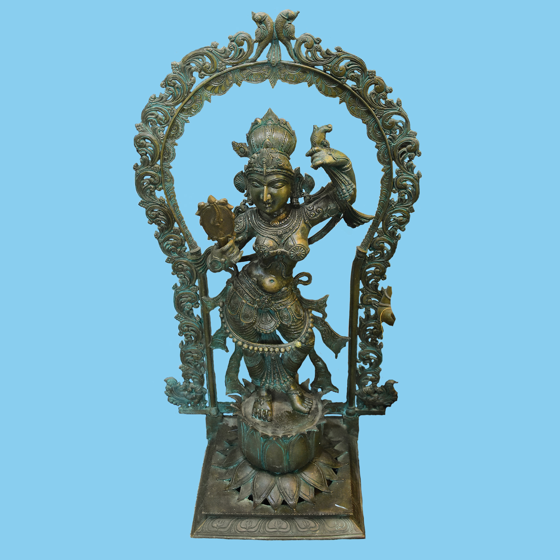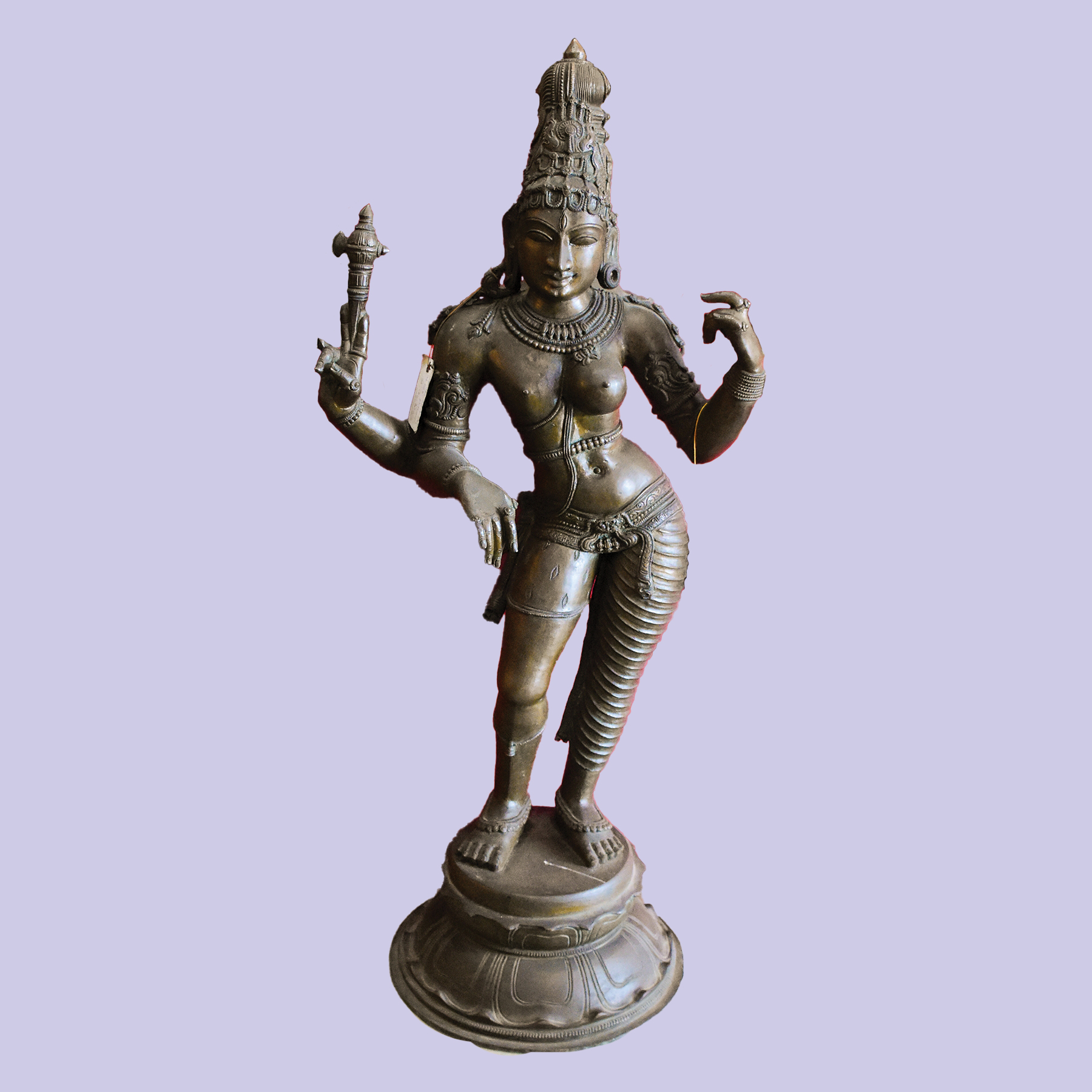 A yellow Ardhanarishwara bronze statue, intricately detailed and depicting the ...