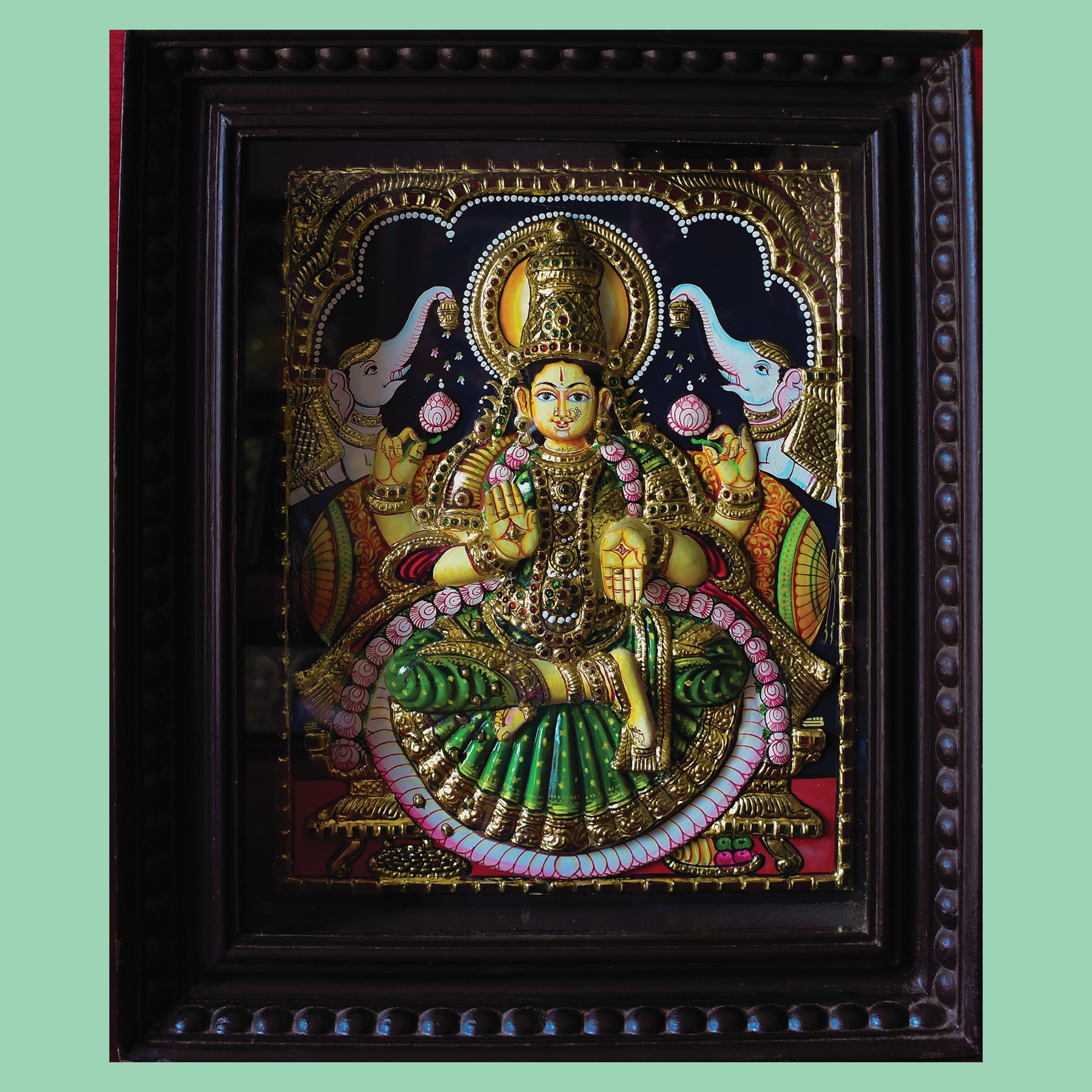 This Tanjore painting of Gaja Lakshmi depicts the goddess on ...