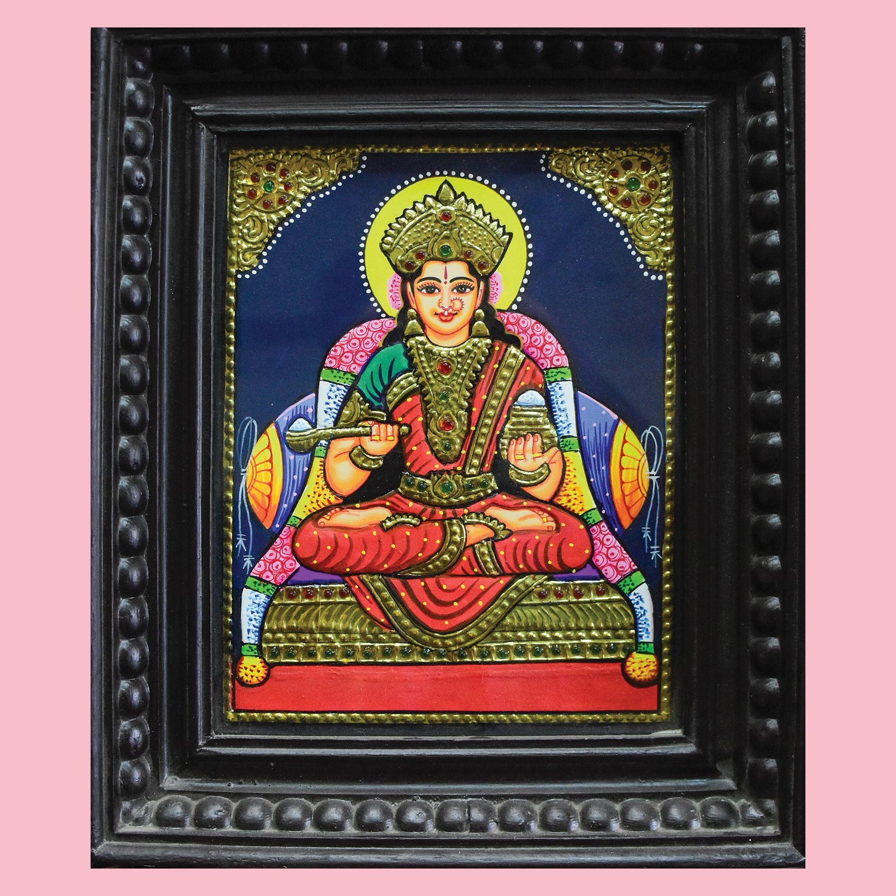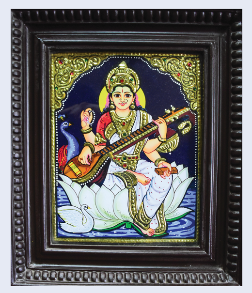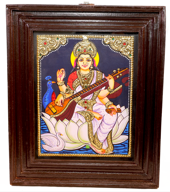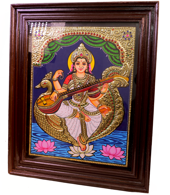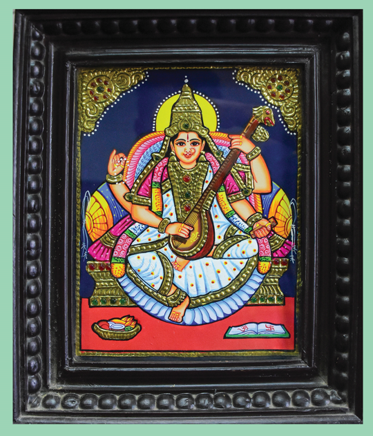This Tanjore painting of Saraswathi Devi showcases vibrant colors and ...
