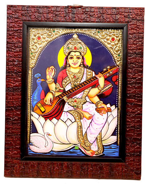 Tanjore painting of Goddess Saraswati, embodying calm and concentration, showcases ...