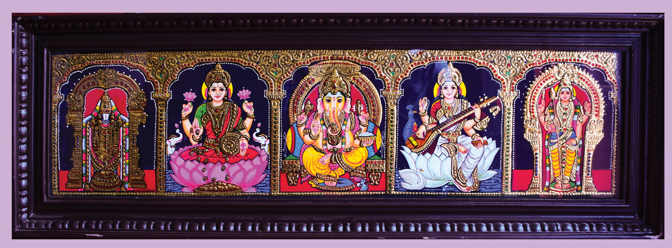 Handcrafted Tanjore paintings, adorned with vibrant colors and the golden-...