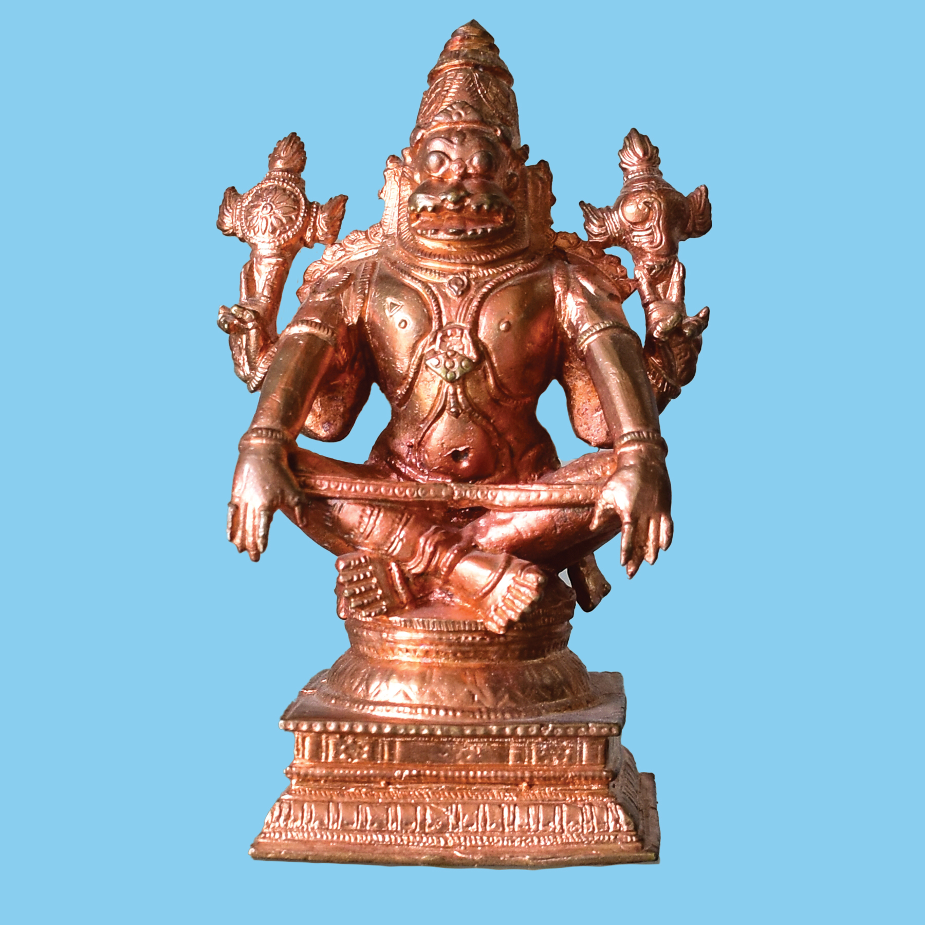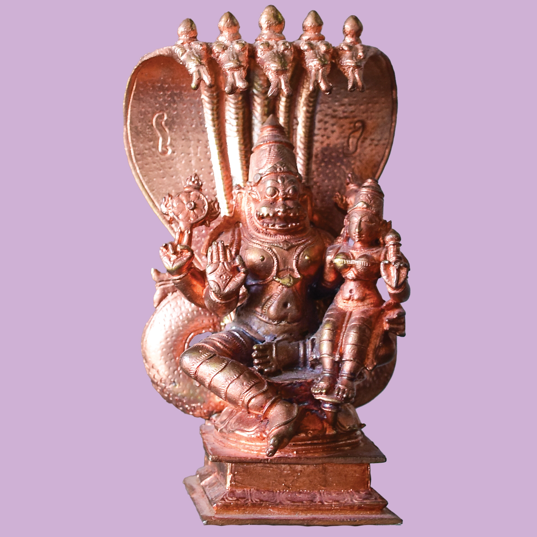 This copper Lakshmi Narasimhar statue features Vishnu's fierce avatar ...