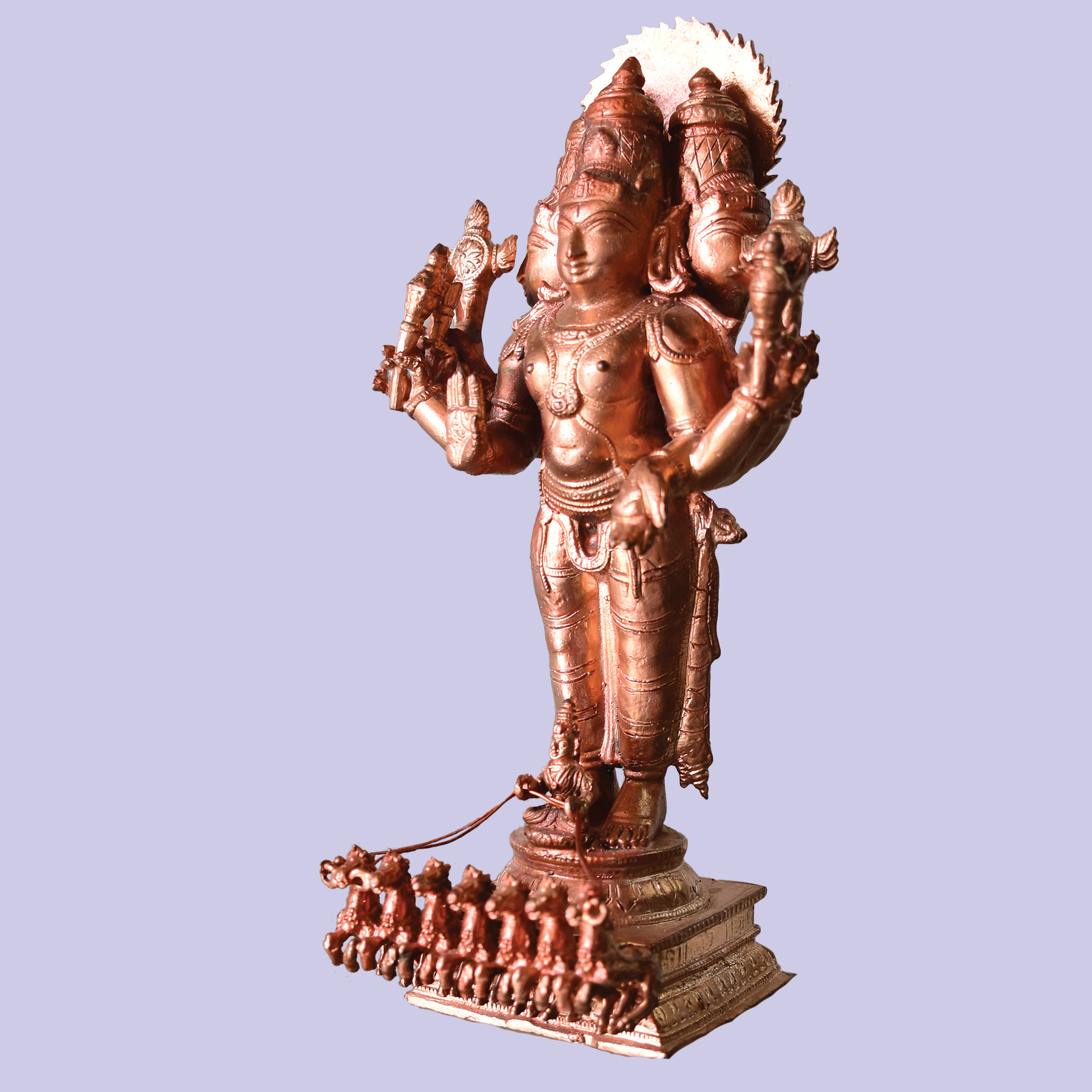 This copper-mixed bronze statue of Sooryanarayanar features three faces ...